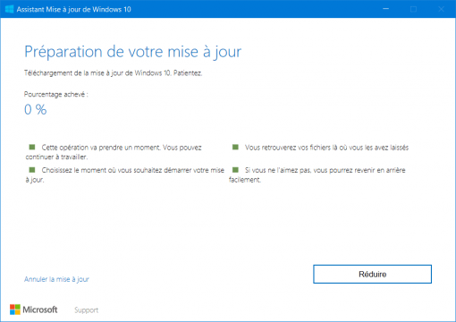 L’assistant lance alors le téléchargement de la mise à jour Windows 10 Creators. Vous pouvez cliquer sur le bouton Réduire afin de laisser le téléchargement se dérouler en tâche de fond.
