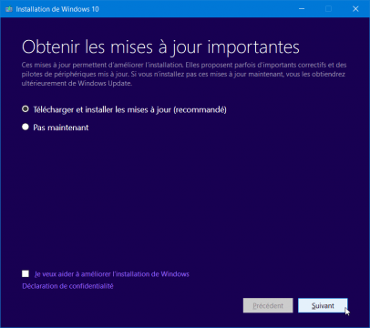 Laissez l’option Télécharger et installer les mises à jour cochée et cliquez sur Suivant.