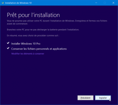 Enfin, cliquez sur le bouton Installer pour lancer l’installation de Windows 10 Creators Update après avoir vérifié que l’option Conserver les fichiers personnels et applications est bien cochée.