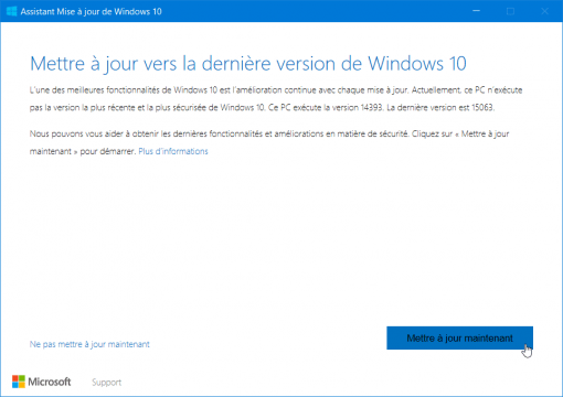 Double-cliquez sur l’exécutable pour lancer l’assistant de mise à jour de Windows 10 puis cliquez sur le bouton Mettre à jour maintenant pour lancer le téléchargement de Windows 10 Creators Update.