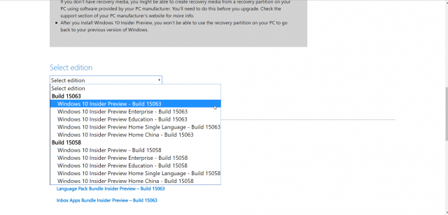 Descendez en bas de la page et sélectionnez l’édition Windows 10 Insider Preview – Build 15063.