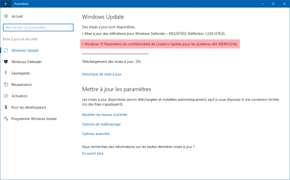 La mise à jour « Windows 10 Paramètres de confidentialité de Creators Update pour les systèmes x64 (KB4013214) » devrait se télécharger et s’installer (si ce n’est pas déjà fait).